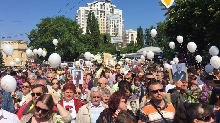 В Киеве в 10 утра стартовал марш Бессмертного полка - люди идут от станции метро Арсенальная с портретами своих родственников, воевавших в Великую Отечественную войну.