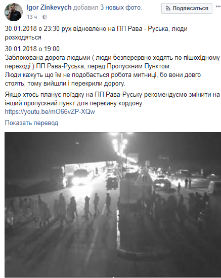 Вечером 30 января на пограничном пункте пропуска "Рава-Русская" во Львовской области несколько десятков человек заблокировали дорогу.