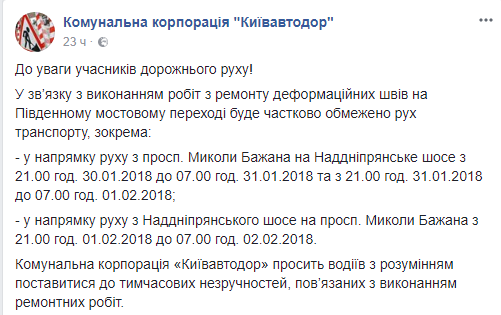- в направлении движения с Надднепрянского шоссе на ул. Николая Бажана с 21:00 01.02.2018 до 7:00 02.02.2018.