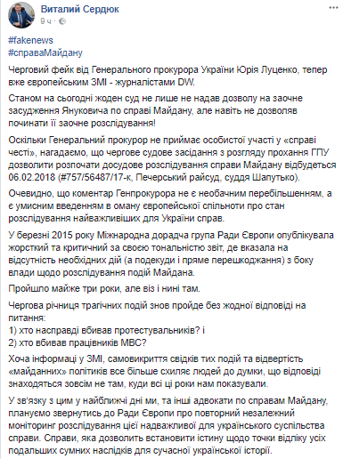 Об этом Виталий Сердюк сообщил в Facebook, комментируя интервью Юрия Луценко для DW, в котором он заявил, что ГПУ получила разрешение на заочное судопроизводство против Януковича, а также экс-главы МВД Виталия Захарченко и экс-главы СБУ Александра Якименко по делу о расстрелах в центре Киева.