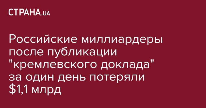 Российские миллиардеры из "кремлевского доклада" после публикации документа за день потеряли 1,1 млрд долларов. Об этом пишет РБК со ссылкой на данные онлайн-рейтинга Forbes.