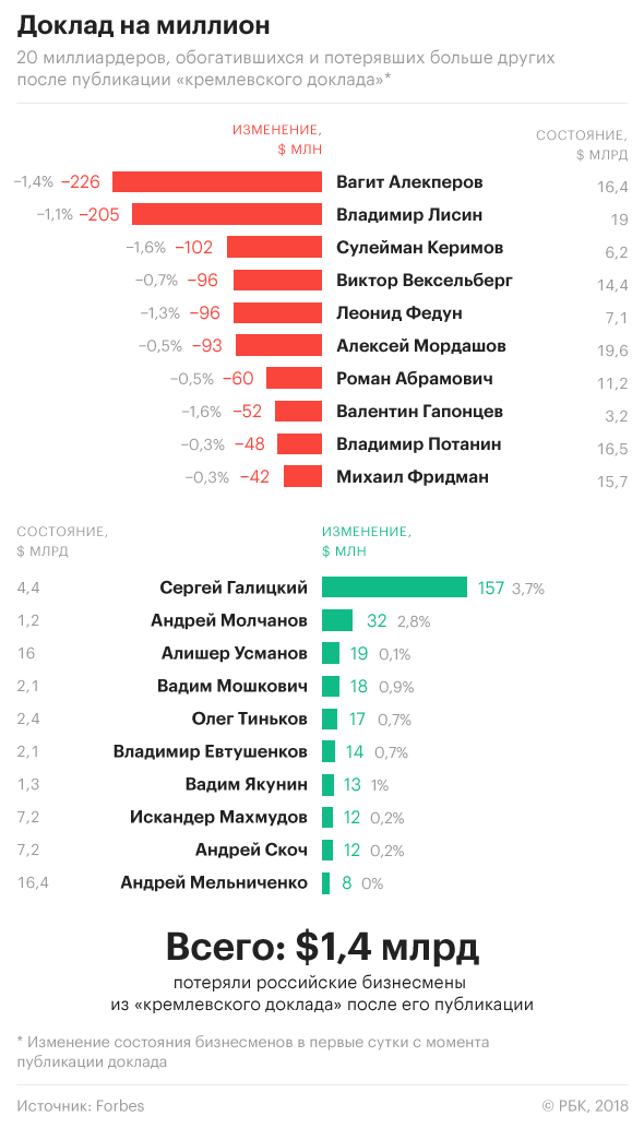 Хотя в целом рынок не слишком активно отреагировал на американский доклад, а некоторые россияне из него даже увеличили свои активы, например, Сергей Галицкий. Они отображены в инфографике.