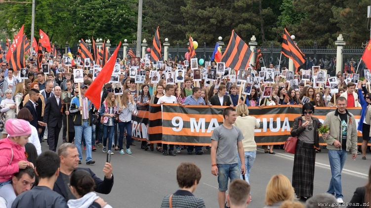 Колонна прошла из центра города к мемориальному комплексу "Вечность". Шествие возглавил лидер Партии социалистов Молдовы Игорь Додон, который также держал табличку с портретом деда, воевавшего в 41-45 г.г.