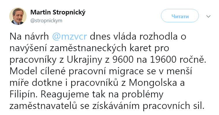 Об этом в Twitter-микроблоге сообщил министр иностранных дел Чехии Мартин Стропницкий.