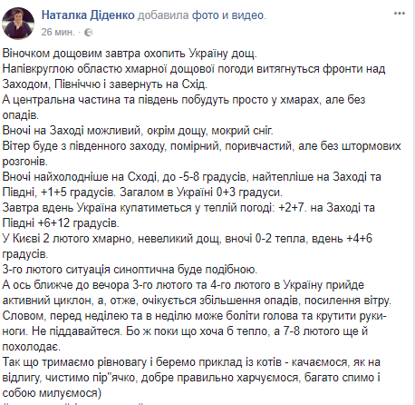 Ближе к вечеру 3 и 4 февраля в Украину придет циклон, а, следовательно, ожидается увеличение осадков, усиление ветра. А 7-8 февраля еще и похолодает.