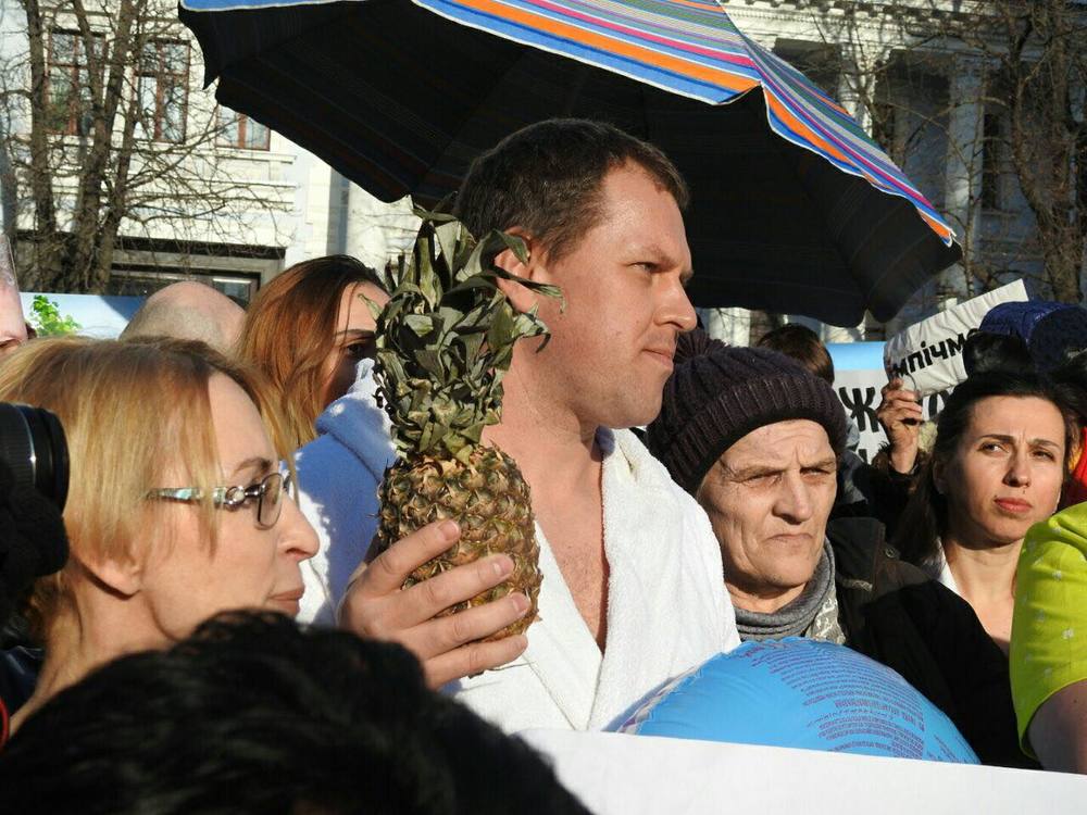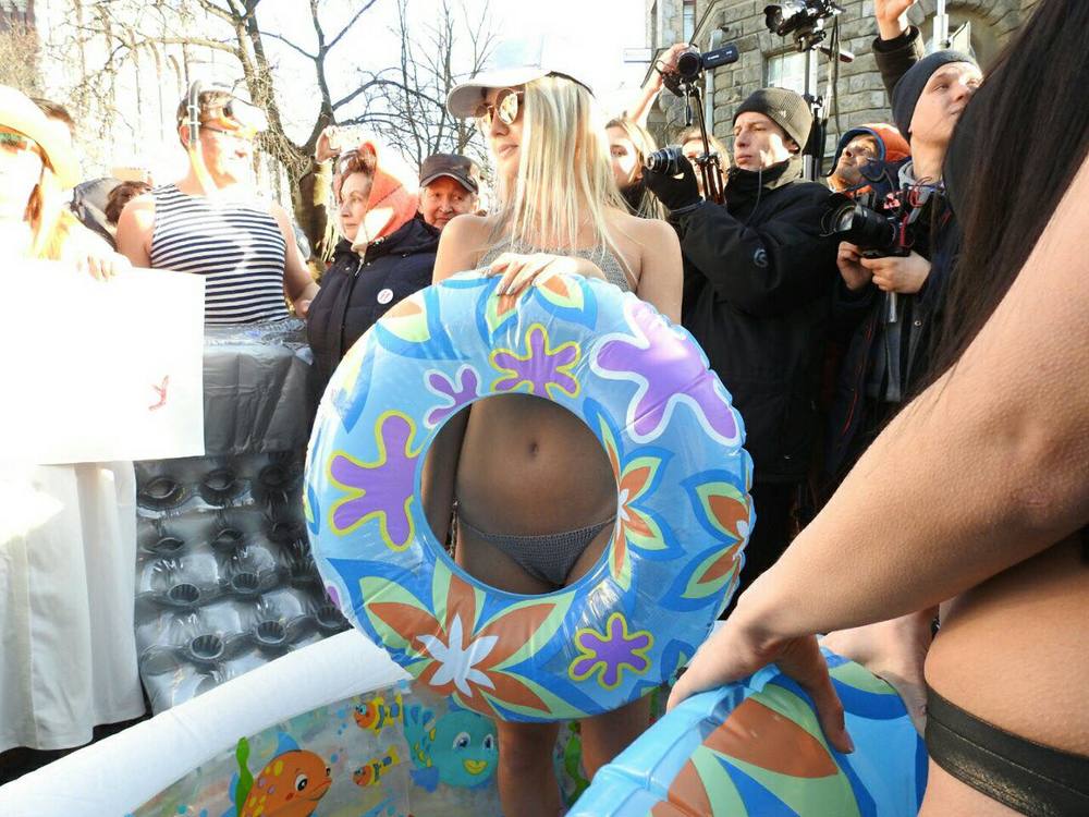 Участники оригинальной акции таким необычным образом вновь привлекли внимание к отдыху президента на Мальдивах. Многие участники даже разоблачились до купальных костюмов, другие же держали в руках ананасы и плакаты с надписью "Poroshenko go away".