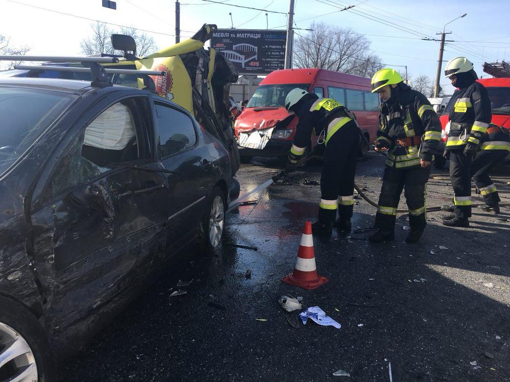 В Днепре на улице Янтарной столкнулись две маршрутки и Peugeot. В результате одна маршрутка перевернулась, передает "Информатор".