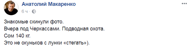 "Знакомые скинули фото. Вчера под Черкассами. Подводная охота. Сом 140 кг", - говорится в сообщении Анатолия Макаренко в Facebook. "Это не окуньков с лунки "стегать", - отметил он.