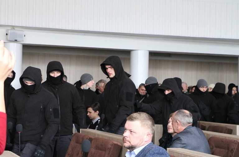 "В начале сессии в зал вошла группа молодчиков в серо-черных формах с надписями "Национальная дружина" и черных формах со значками Национального корпуса "Азов". Все они были замотаны шарфами или в балаклавах с капюшонами, а также с явными признаками того, что у них есть оружие (они зашли с такими сумками, которые предназначены для скрытого ношения оружия). Они стали между рядами, забрались на трибуну, а их лидер Дмитрий Кухарчук и бывший заместитель мэра Анатолия Бондаренко – Геннадий Шевченко – вместе с некоторыми АТОшниками, заблокировали трибуну. При этом Кухарчук выкрикнул на весь зал: "Депутатов не выпускать". Вот так началась сессия", – рассказал в комментарии "Обозревателю" депутат Черкасского горсовета Александр Згиблов.
