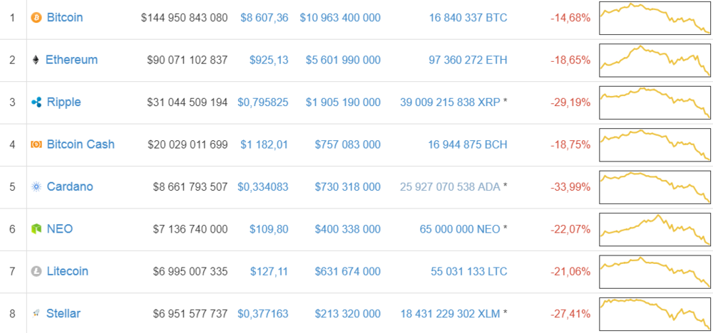 Курс биткоина опустился за сутки до $8 607.