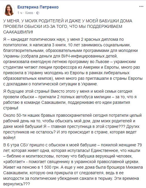 "У меня и моей семьи сегодня провели обыски - пригнали 2 полных автобуса милиции - за то, что я работаю в команде Саакашвили, поддерживаю его идеи развития страны! Около 50-ти наших бравых правоохранителей сегодня потратили целый рабочий день на то, чтобы обыскать мой дом, дом моих родителей и даже моей бабушки! Я - главная преступница в этой стране??? Других преступников не осталось? И это происходит в стране, которая ведет войну! При этом в квартире выломали двери, толкали ее маму, которая испугалась и пыталась не пустить СБУшников, подняли шум на весь подъезд, из-за чего соседи вызывали 2 раза полицию, а у соседки сердце схватило. Консьержка решила, что бандиты пришли, ведь силовики не представились ей", - заявляет Петренко.