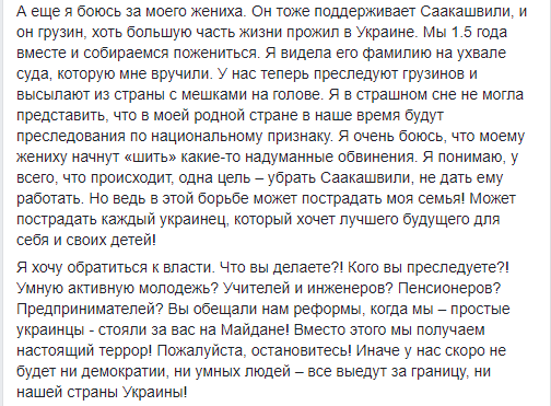 А еще я боюсь за моего жениха. Он тоже поддерживает Саакашвили, и он грузин, хоть большую часть жизни прожил в Украине. Мы 1.5 года вместе и собираемся пожениться. Я видела его фамилию на ухвале суда, которую мне вручили. У нас теперь преследуют грузинов и высылают из страны с мешками на голове", - беспокоится активистка, что ее жениху "сошьют" какое-то дело просто по национальному признаку.