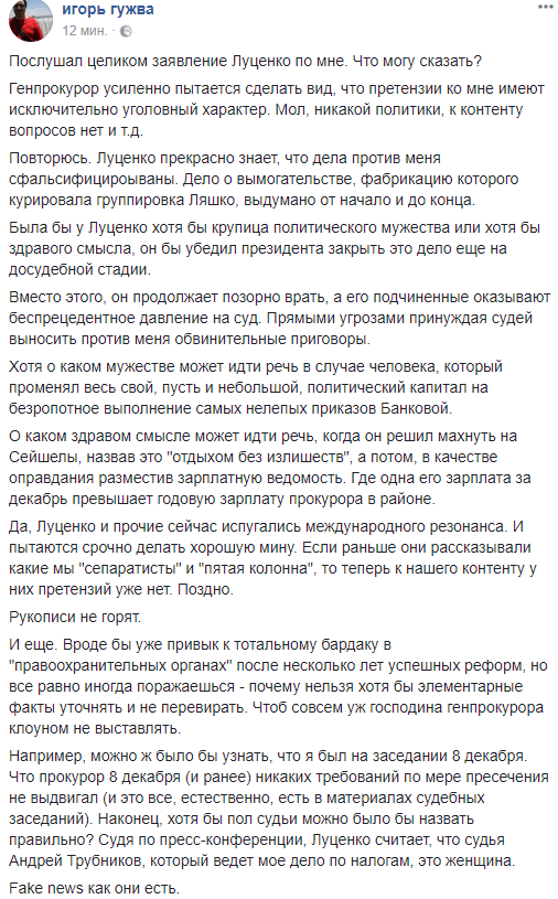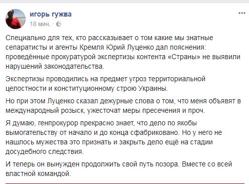 Главный редактор "Страны" Игорь Гужва, который был вынужден просить политическое убежище в Австрии, на своей странице в Facebook прокомментировал заявление генпрокурора Юрия Луценко в свой адрес.