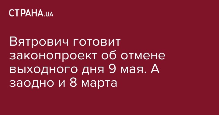 "Мы готовим проект закона о государственных праздниках, цель которого – существенно сократить количество выходных. Я убежден, что это абсолютно приемлемо для той ситуации, в которой находится Украина. Одно из наших предложений – сделать 9 мая рабочим днем. Но он останется праздником, внимание к старшему поколению, участникам войны не будет уменьшено", – сказал Вятрович.