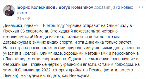 "Динамика, однако… В этом году Украина отправит на Олимпиаду в Пхечхан 33 спортсмена. Это худший показатель за историю независимости! Исходя из этого, становится понятно, что мы деградируем в зимних видах спорта, и эта динамика только растет. Наша страна располагает всеми природными условиями для успешного участия в "белой" Олимпиаде, хорошими методиками и персоналом в области подготовки спортсменов", - пишет экс-нардеп.