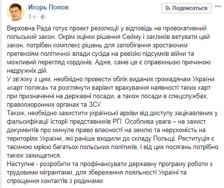 По его словам, Верховная Рада готовит проект резолюции "в ответ на провокационный польский закон".