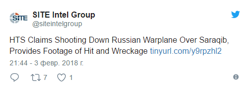 Террористическая организация "Хайет Тахрир аш-Шам" (прежнее название - "Джебхат ан-Нусра") взяла на себя ответственность за атаку, в результате которой был сбит российский штурмовик Су-25.