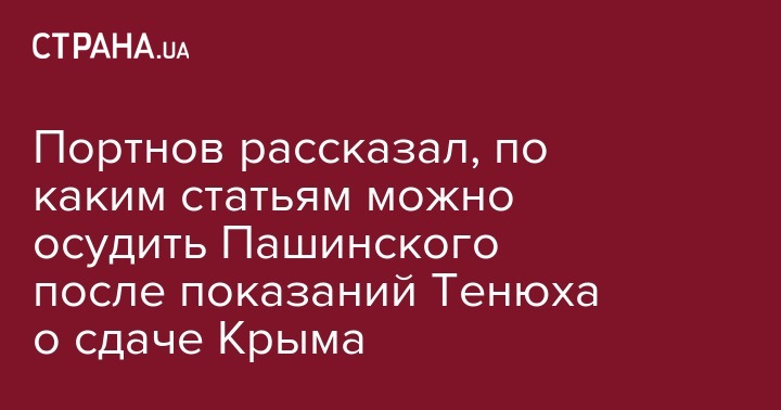 "После обнародования в суде официальных показаний экс-министира обороны Тенюха, о том что именно бывший глава Администрации Президента и фукционер Народного Фронта Пашинский принял решение о выходе и передаче российским войскам Крыма, к уже имеющимся преступлениям о хищениях государственных активов и стрельбе в киевского прохожего, добавился новый букет", - сказал Портнов в комментарии "Стране" и перечислил статьи из этого "букета".