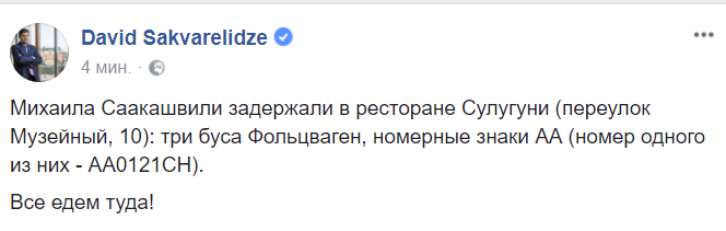 15:12 "Михаила Саакашвили задержали в ресторане Сулугуни (переулок Музейный, 10): три буса Фольцваген, номерные знаки АА (номер одного из них - АА0121СН).