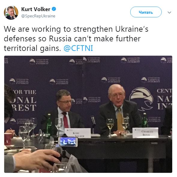 Об этом заявил специальный представитель США по Украине Курт Волкер во время панельной дискуссии в Центре национальных интересов США в Вашингтоне, говорится на странице Волкера в Twitter.