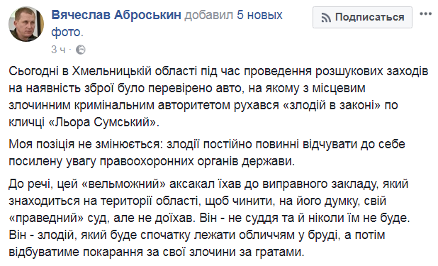 Об этом на своей Facebook-странице сообщил первый заместитель главы Национальной полиции Украины Вячеслав Аброськин.