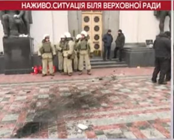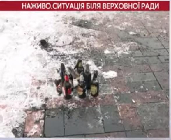 Сейчас митингующие стоят у ограждения перед входом в Раду, а напротив них - силовики. Сейчас все мирно. Но возле входа в парламент на полу появился черный след - как от взрыва или огня. Также недалеко стоит несколько стеклянных бутылок. Возможно, это коктейли Молотова.