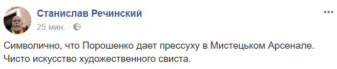 14:47 "Символично, что Порошенко дает прессуху в Мистецьком Арсенале. Чисто искусство художественного свиста", - иронизирует журналист Станислав Речинский.