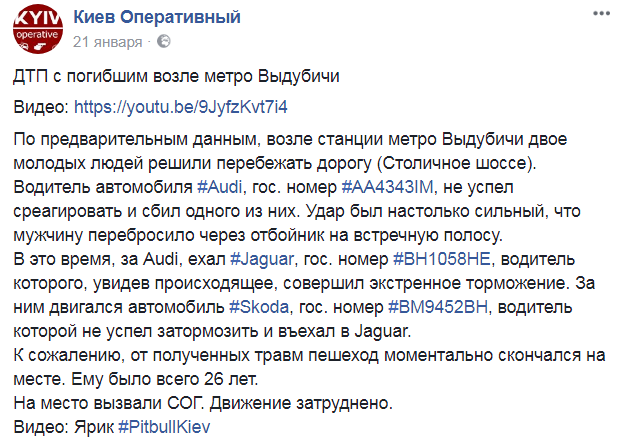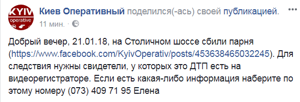 Для следствия особо нужны свидетели, у которых это ДТП есть на видеорегистраторе, передает КиевОперативный.