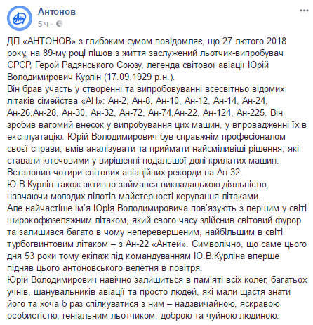 "Госпредприятие "Антонов" с глубоким прискорбием сообщает, что 27 февраля 2018 года на 89-м году ушел из жизни заслуженный летчик-испытатель СССР, герой Советского союза, легенда мировой авиации Юрий Владимирович Курлин (17.09.1929 г.р.)", - отмечается в сообщении.