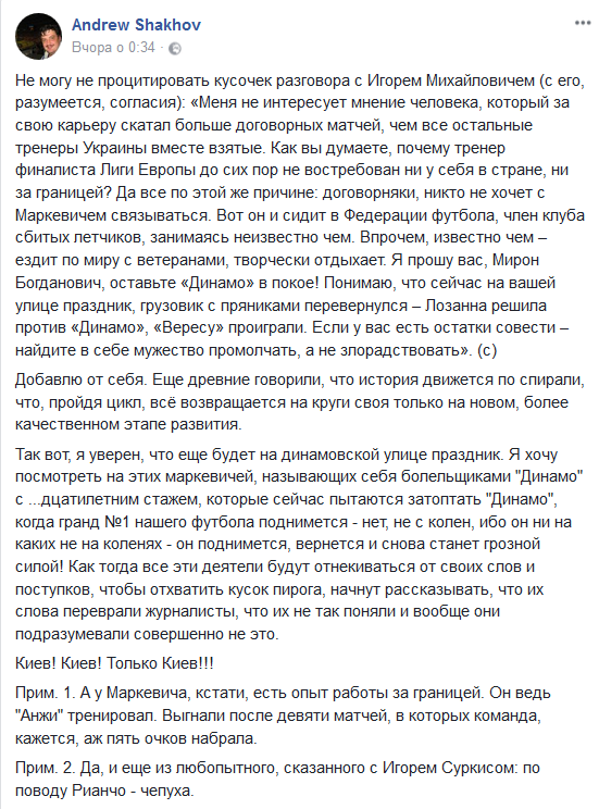 "Не могу не процитировать кусочек разговора с Игорем Михайловичем (с его, разумеется, согласия): "Меня не интересует мнение человека, который за свою карьеру скатал больше договорных матчей, чем все остальные тренеры Украины вместе взятые. Как вы думаете, почему тренер финалиста Лиги Европы до сих пор не востребован ни у себя в стране, ни за границей? Да все по этой же причине: договорняки, никто не хочет с Маркевичем связываться. Вот он и сидит в Федерации футбола, член клуба сбитых летчиков, занимаясь неизвестно чем. Впрочем, известно чем - ездит по миру с ветеранами, творчески отдыхает. Я прошу вас, Мирон Богданович, оставьте "Динамо" в покое! Понимаю, что сейчас на вашей улице праздник, грузовик с пряниками перевернулся - Лозанна решила против "Динамо", "Вересу" проиграли. Если у вас есть остатки совести - найдите в себе мужество промолчать, а не злорадствовать".
