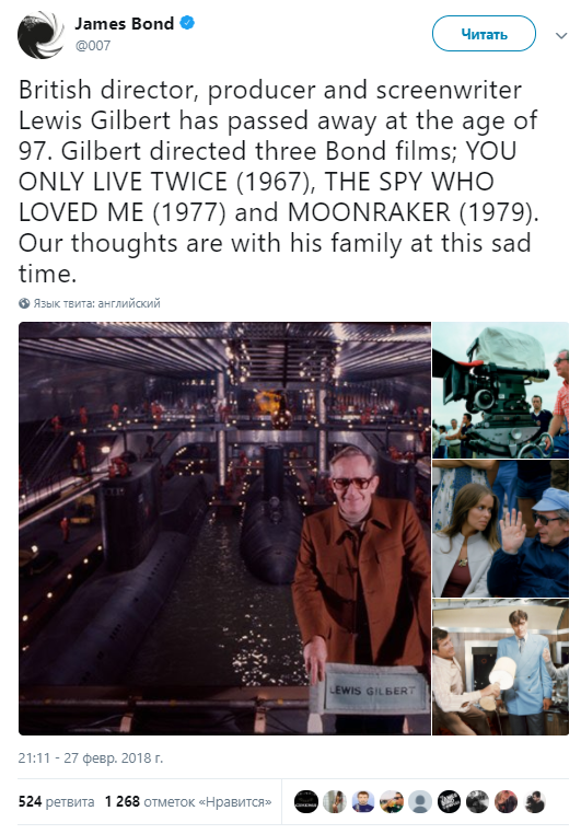 В Монако в возрасте 97 лет скончался известный британский кинорежиссер Льюис Гилберт, снявший три фильма про Джеймса Бонда. Об этом сообщается на официальной странице франшизы в Twitter.