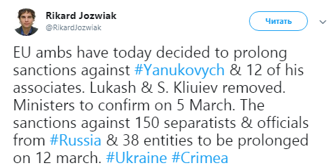 При этом, по его информации, санкции против бывшего президента Януковича и 12 его "сообщников" решили продолжить.