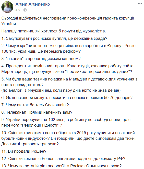 "Была ли ваша тайная поездка на Мальдивы основанием для отстранения с поста президентства? (По аналогии с Януковичем, когда пару дней никто не знал где он)", - пишет Артеменко.