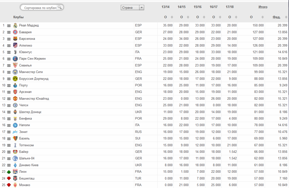 Рейтинг УЕФА. 25 сильнейших клубов Европы (по состоянию на 28 февраля)