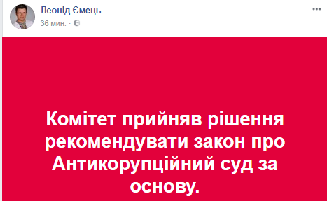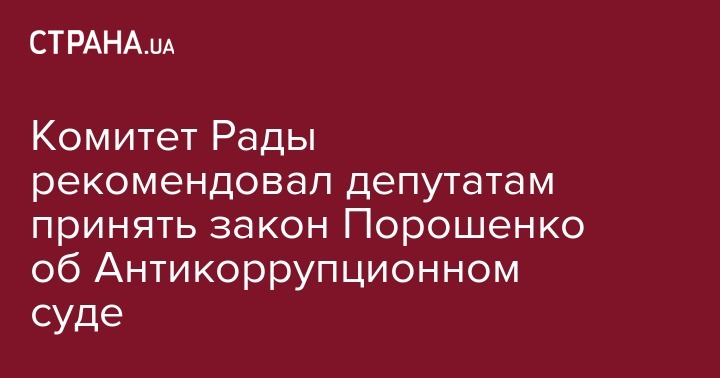 Комитет по вопросам правовой политики и правосудия рекомендовал принять законопроект об Антикоррупционном суде за основу. Речь идет о законопроекте №7440, который внес в Раду президент Петр Порошенко, при том, что ранее МВФ признал данный законопроект не соответствующим международным нормам.