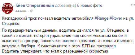 Каскадерский трюк выполнил водитель автомобиля Range Rover на ул. Стеценко в Киеве 28 февраля. Об этом сообщает "Киев Оперативный" в facebook