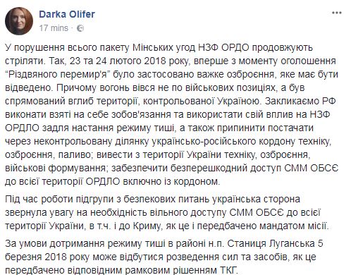 Кроме того, по ее словам, во время переговоров украинская сторона настаивала на необходимости свободного доступа наблюдателей ОБСЕ по всей территории Украины, в том числе и Крыма.