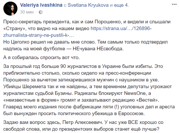 О незаданном вопросе "Страны" написала в Facebook наш журналист Валерия Ивашкина, которая ходила на пресс-конференцию.