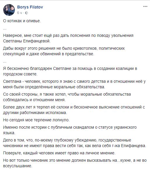 В следующем посте Филатов пояснил свое решение. "Дело в том, что, по моему глубокому убеждению, государственные чиновники не имеют права вести себя так, как вела себя г-жа Епифанцева.
