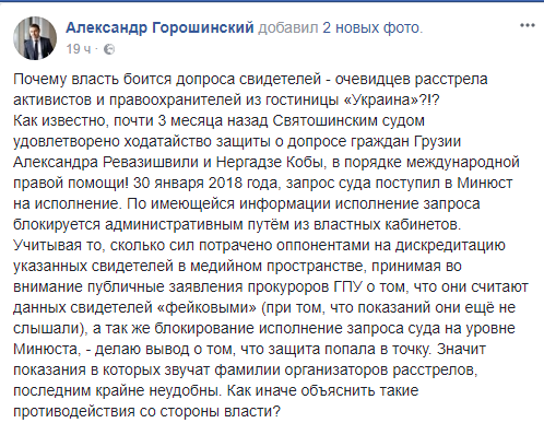"30 января 2018 года запрос суда поступил в Минюст на исполнение. По имеющейся информации, исполнение запроса блокируется административным путем из властных кабинетов. Учитывая то, сколько сил потрачено оппонентами на дискредитацию указанных свидетелей в медийном пространстве, принимая во внимание публичные заявления прокуроров ГПУ о том, что они считают данных свидетелей "фейковыми" (при том, что показаний они еще не слышали), а также блокирование исполнения запроса суда на уровне Минюста, - делаю вывод о том, что защита попала в точку. Значит показания, в которых звучат фамилии организаторов расстрелов, последним крайне неудобны", - заявил Горошинский.