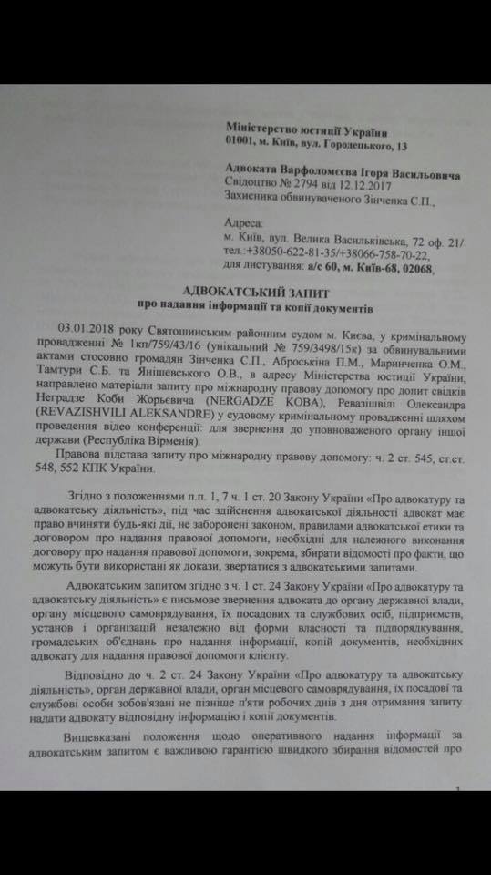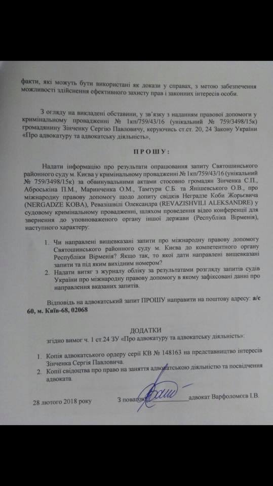 Также Горошинский публикует скан-копии адвокатского запроса в Минюст от 28 февраля, где просит сообщить, начата ли Украиной вообще процедура международной правовой помощи для подготовки видео-допроса в суде Армении указанных лиц с тем, чтобы украинский суд мог в ближайшее время заслушать их показания.
