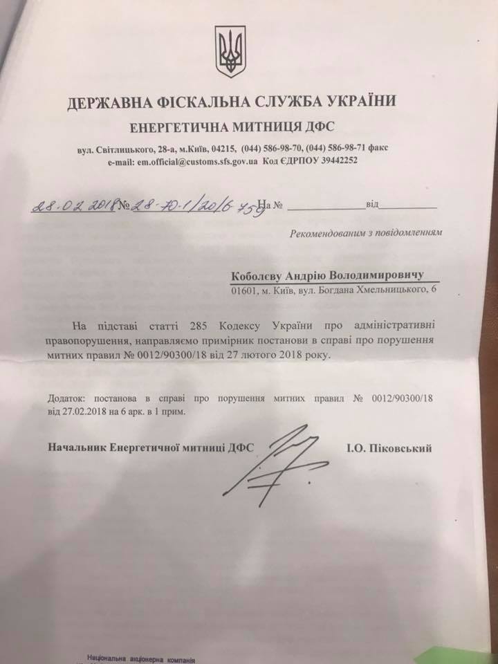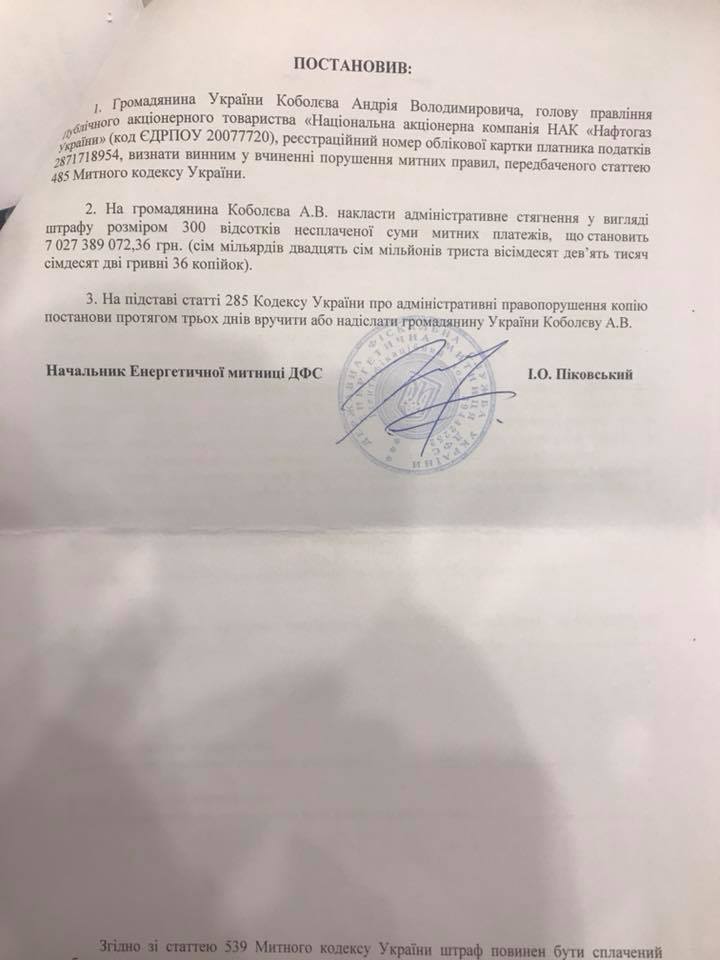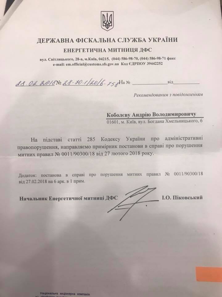 Глава правления "Нафтогаза" Андрей Коболев рассказал, что сегодня, 1 марта, получил от Государственной фискальной службы Украины два персональных штрафа на сумму 7 и 1,3 млрд грн.