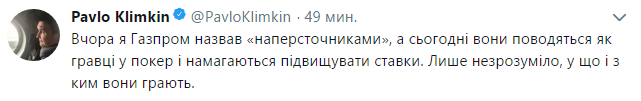"Вчера я "Газпром" назвал "наперсточниками", а сегодня они ведут себя, как игроки в покер, и пытаются повышать ставки. Только непонятно, во что и с кем они играют ", - говорится в его сообщении в Twitter.