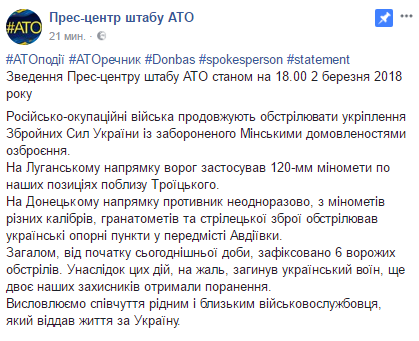 "С начала сегодняшних суток зафиксировано 6 обстрелов. В результате этих действий, к сожалению, погиб украинский военный, еще двое наших защитников получили ранения", - говорится в сводке по состоянию на 18:00 пятницы, опубликованной на странице пресс-центра в Facebook.