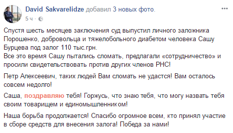 "Спустя шесть месяцев заключения суд выпустил … добровольца и тяжелобольного диабетом человека Сашу Бурцева под залог 110 тыс. грн", - написал один из лидеров партии "Рух новых сил" Давид Сакварелидзе на странице в Facebook в пятницу.