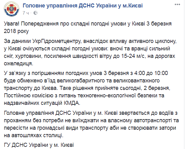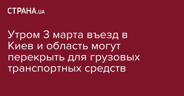 "Согласно решению постоянной комиссии по техногенно-экологической безопасности и чрезвычайным ситуациям планируется ограничение на въезд в город Киев грузовых транспортных средств в период с 04.00 до 10.00 3 марта и по Киевской области в период с 03.00 3 марта до особого распоряжения", – указано в опубликованном сообщении.