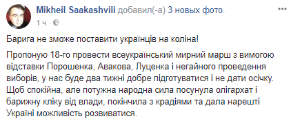 "Предлагаю 18-го провести всеукраинский мирный марш с требованием отставки Порошенко, Авакова, Луценко и незамедлительного проведения выборов", – написал Саакашвили.