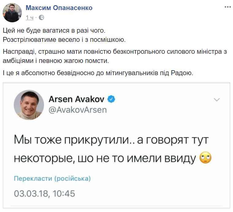 Журналист-расследователь Максим Опанасенко пишет, что страшно иметь полностью бесконтрольного силового министра с амбициями и определенной жаждой мести.