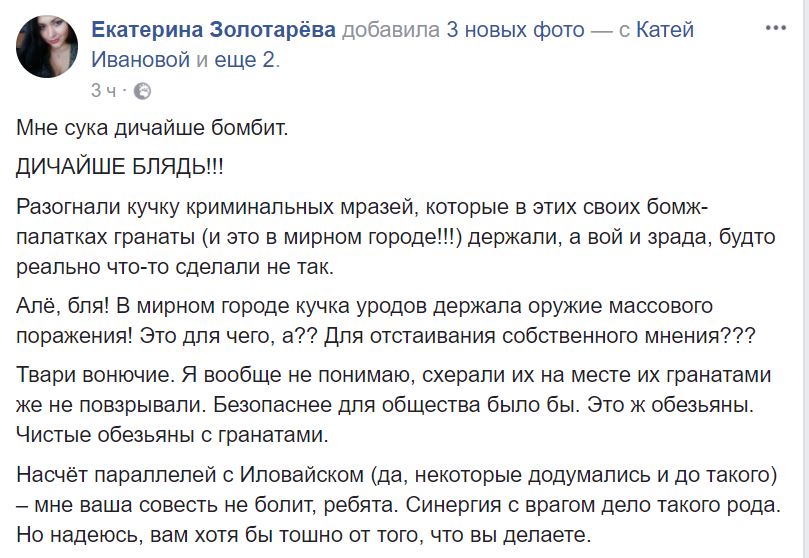 "Разогнали кучку криминальных мразей, которые в этих своих бомж-палатках гранаты (и это в мирном городе!!!) держали, а вой и зрада, будто реально что-то сделали не так", – пишет блогерша. Далее она предложила взорвать их теми же гранатами (скриншот не приводится из соображений морали. – Прим. Ред.)