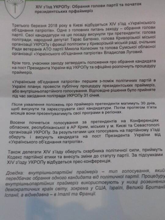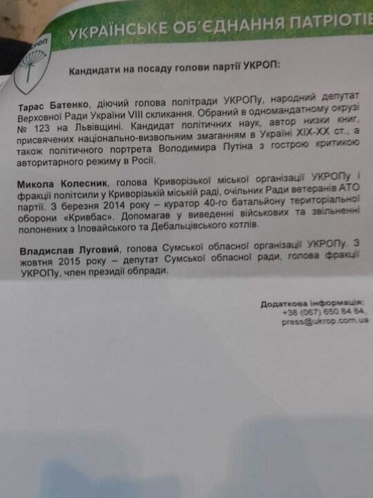 По итогам финального голосования, новым главой партии избрали народного депутата Тараса Батенко. Его кандидатуру поддержал 341 делегат съезда.